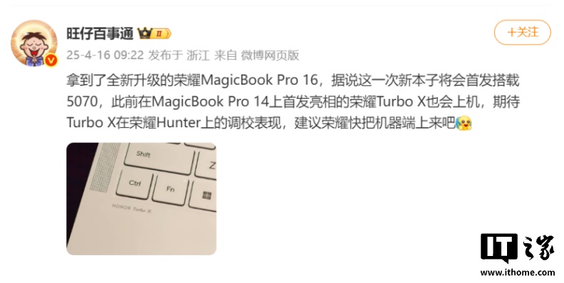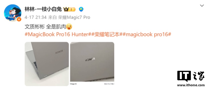 IT之家 4 月 22 日消息,IT之家从可靠渠道获悉,荣耀 MagicBook Pro 16 HUNTER 笔记本即将迎来重大升级,计划于 4 月底正式发布。