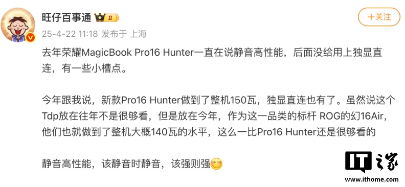 而就在今日上午,数码 KOL 再次爆料:荣耀 MagicBook Pro 16 HUNTER 版的 TDP 高达 150W。对比今年轻薄高性能本领域的标杆产品 ROG 幻 16 Air,其整机功耗约 140W 水平,称 MagicBook Pro 16 HUNTER 版“静音高性能,该静音时静音,该强则强”。