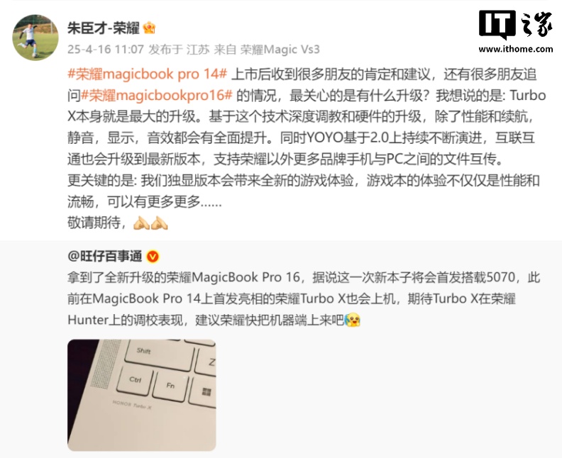 该消息迅速引发热议,荣耀高管 @朱臣才 - 荣耀也在微博上对此进行了回应。虽然他并未直接证实消息的真实性,但也没有予以否认,反而着重强调,Turbo X 技术本身就是此次升级的核心亮点。基于 Turbo X 技术的深度优化与硬件配置的全面升级,新机在性能、续航、静音效果、显示画质及音效等方面都将实现全方位提升。与此同时,智能助手 YOYO 也将在 2.0 版本的基础上持续迭代升级,设备间的互联互通功能将更新至最新版本,届时将支持更多非荣耀品牌手机与 PC 之间的文件快速互传,极大拓展了跨设备协作的兼容性与便捷性。