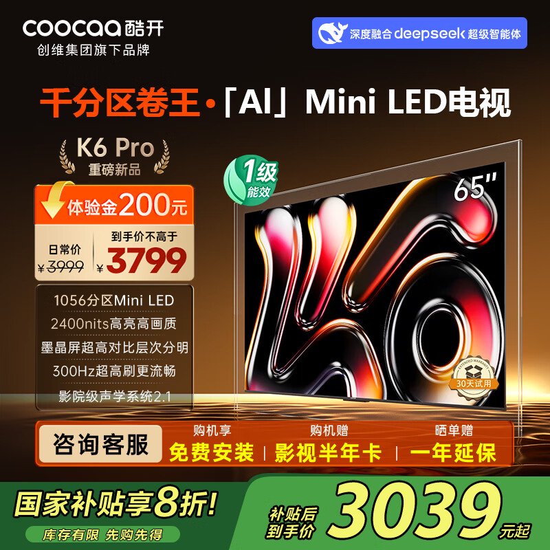 与此同时,酷开还推出了多款硬件,例如全新的“AI”Mini LED 电视 K6 Pro,提供 65 英寸、75 英寸、85 英寸三个版本,分别为 3799 元、4999 元、6699 元,最高具备 1512 分区、300Hz 刷新率。