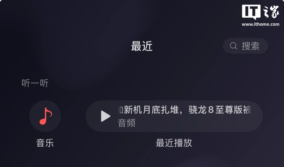 在微信主界面下滑拉出“最近”界面,上方的听一听板块中取消了“音频”选项,仅保留“音乐”和“最近播放”。
