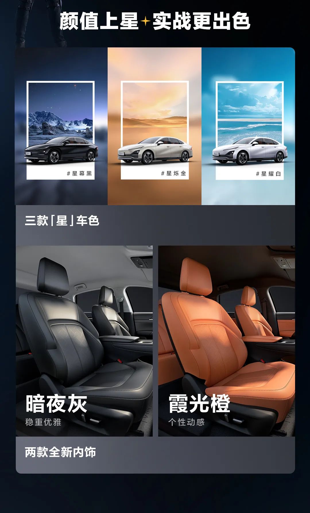 该车尺寸为 4835x1860x1515mm,轴距达 2800mm,与 2024 款相同;搭载 LED 自动星彩灯组,配有贯穿式星环尾灯,还有 18 寸精车星旋轮毂以及半隐藏式门把手,可选三种车身外观配色。
