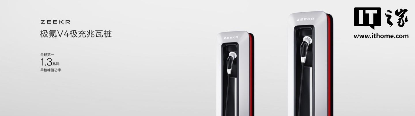 IT之家 4 月 23 日消息,今日上海车展,极氪科技集团全球首发 V4 极充兆瓦桩,单枪峰值功率 1.3 兆瓦,单枪峰值电流 1300A,双 1300 全球第一。