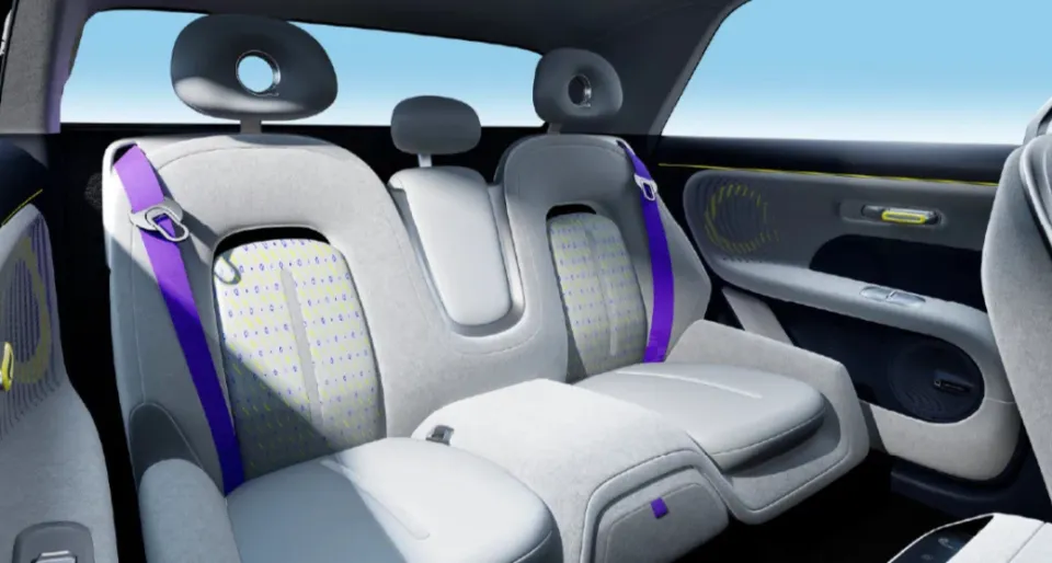 此外,新车通过熏黑处理的 A 柱与 C 柱,打造出悬浮式车顶的效果,配合隐藏式门把手设计,整体造型时尚且富有科技感。车尾部分,贯穿式尾灯与梯形造型的下部保险杠相互呼应,进一步增强了车辆的整体感。