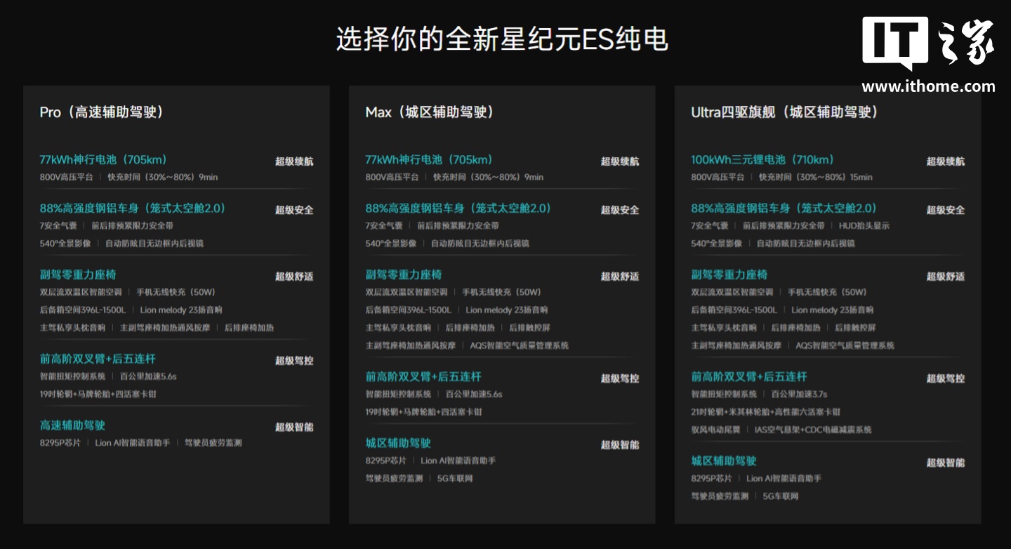 动力与续航方面,星纪元 ES 纯电版将提供 77 千瓦时和 100 千瓦时两种电池组配置,对应的续航里程分别为 705 公里和 710 公里。