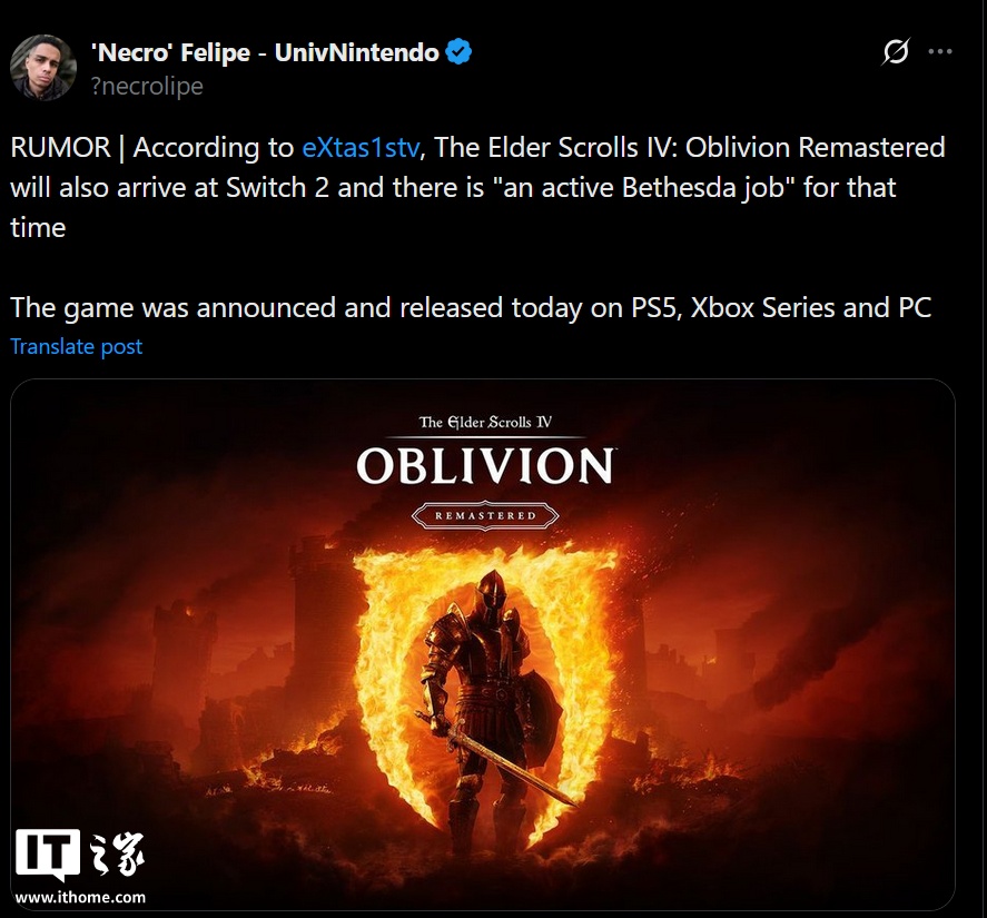 IT之家 4 月 23 日消息,爆料者 eXtas1stv 在 X 平台透露,贝塞斯达正为《上古卷轴 4:湮灭 重制版》登陆任天堂 Switch 2 进行“积极工作”。这款经典重制作品有望加入日益壮大的 Switch 2 第三方游戏阵容,利用 Switch 2 升级的硬件性能以及 DLSS 等特性。