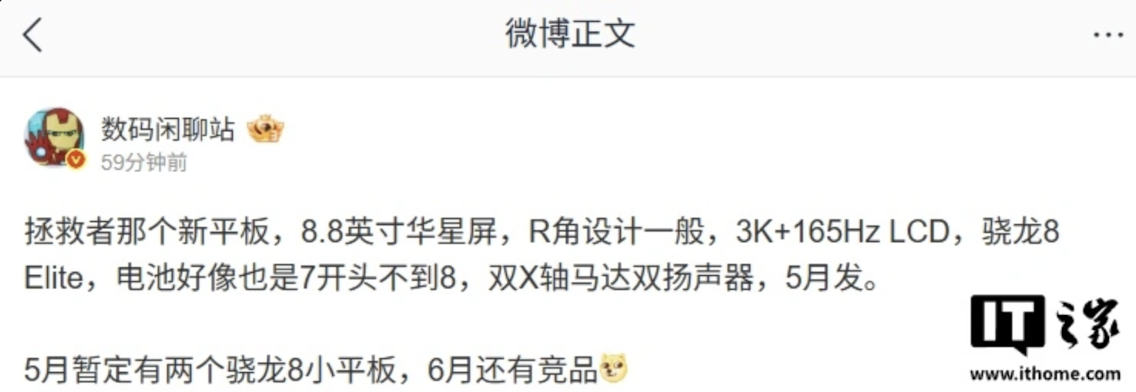 值得注意的是,微博博主 @数码闲聊站曾于 4 月 16 日爆料该产品的电池容量、马达配置和屏幕尺寸,三项爆料均与本次官方公布的参数吻合,该博主还爆料新品将搭载 3K 165Hz LCD 华星屏,这项参数还有待证实。