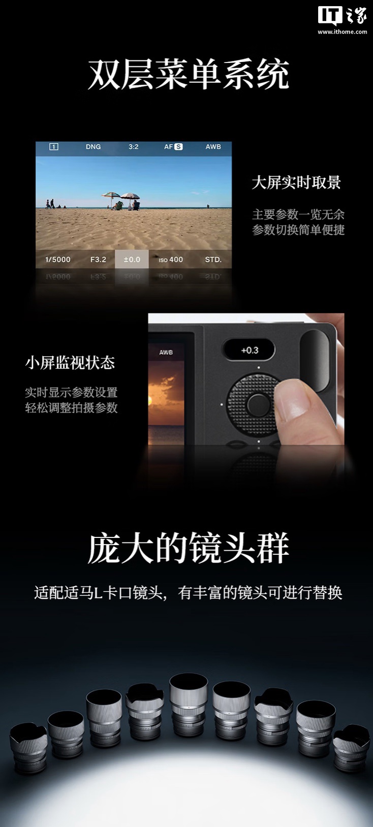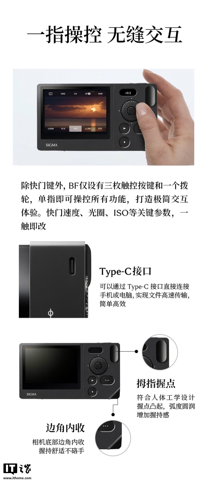 官方称这款相机代表了一种使用相机的全新、更直观的方式,机身背面只有一个转盘、三个按键,强调单指操作,便于摄影师街头快拍。