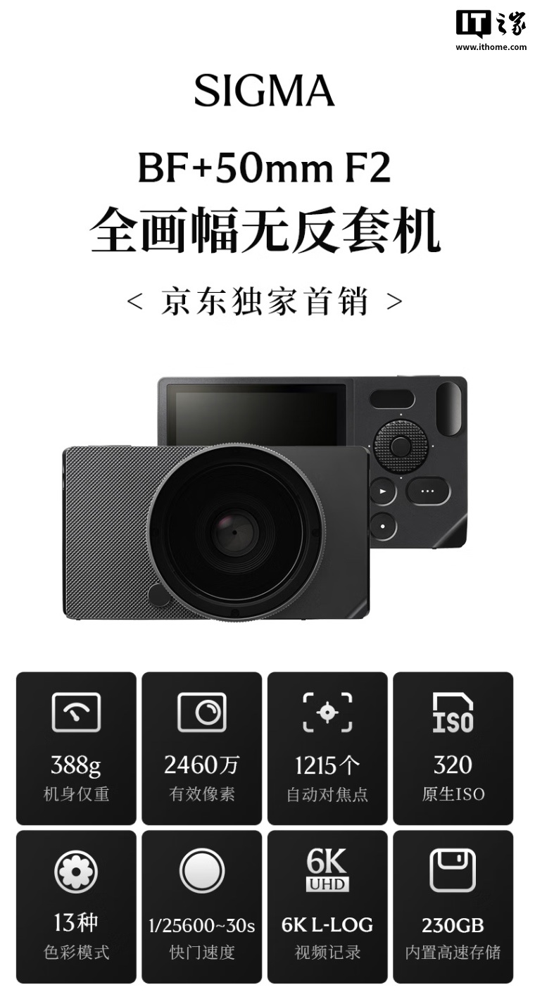 IT之家 4 月 23 日消息,适马今年 2 月推出了概念相机 Sigma BF,这款相机采用 24.6MP 全画幅传感器,使用 L 卡口,主打极简设计,是此前 FP 等产品的继承者,目前该机国行在京东开启首销,但没有提供单机身销售,仅提供 35mm F2 / 50mm F2 套机可选,IT之家整理具体定价如下: