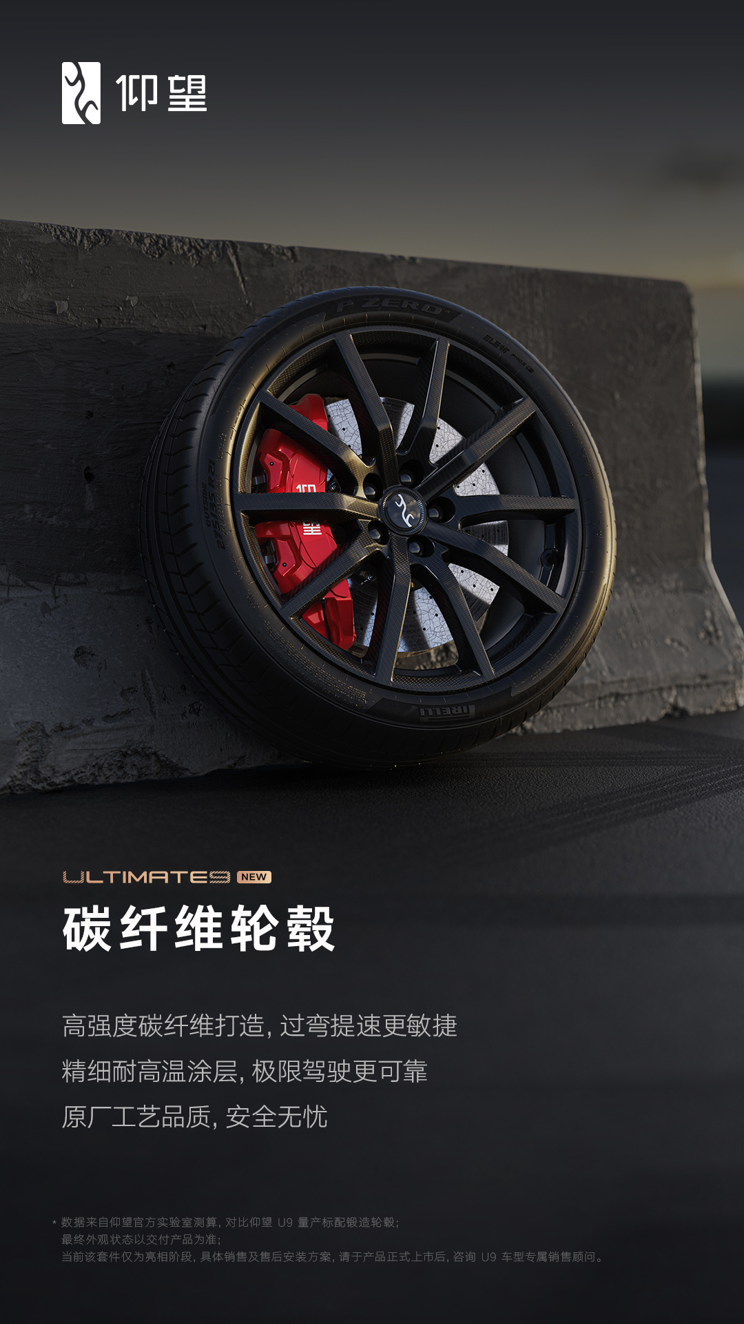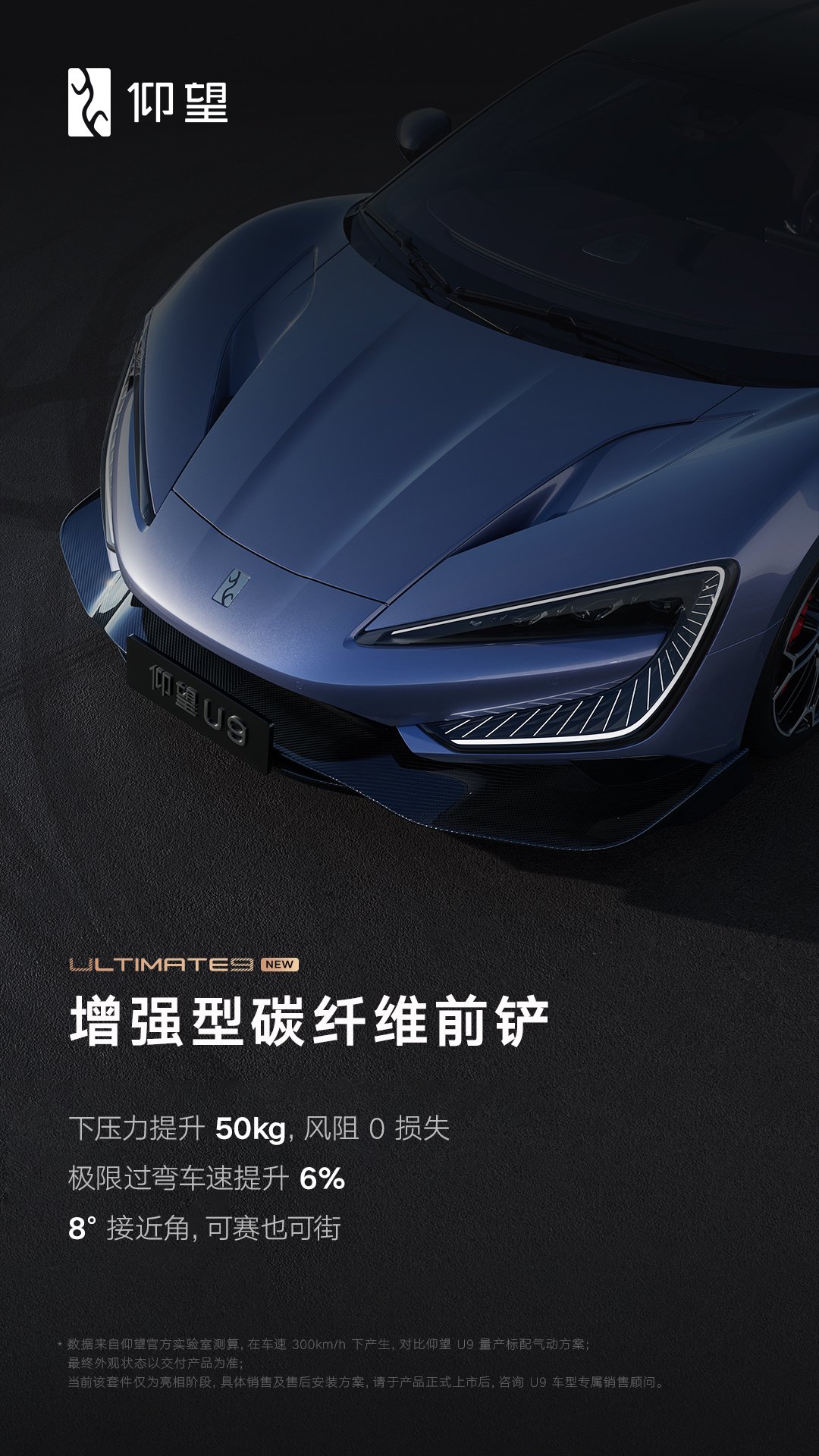 仰望 U9 长宽高分别为 4966x2029x1295/1338mm,轴距 2900mm;标配碳纤维车顶、尾部扩散器,可选配赛车尾翼;有月曜银、阿盖尔紫、赤霞丹朱三种颜色可选。