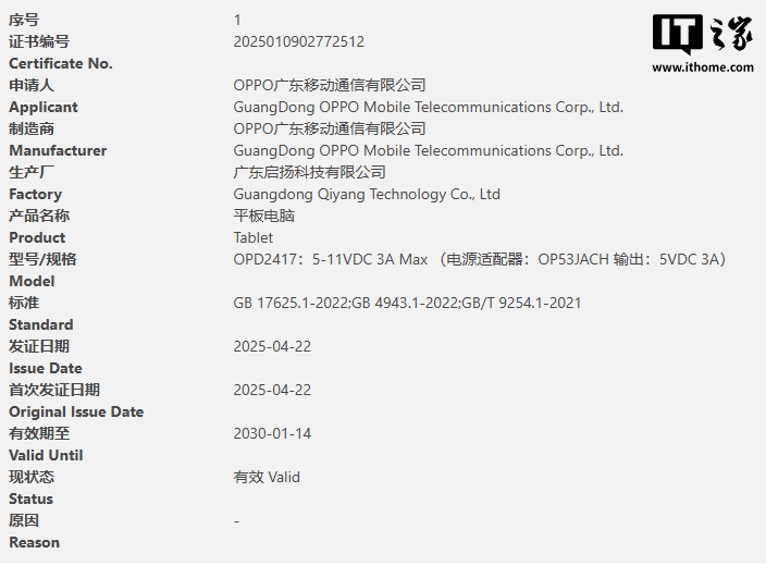 IT之家 4 月 24 日消息,型号为“OPD2417”的 OPPO 安卓平板通过中国强制性产品认证(3C 认证),支持 33W 有线充电和 15W 反向无线充电。
