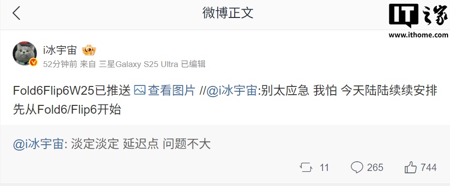 根据三星公布的 One UI 7 升级计划通知 O,三星 Galaxy Z Flip 6、Fold 6、W25、W25 Flip、S24、S24+、S24 Ultra 将在本月获得推送。博主 @i冰宇宙 表示,其他机型也将在今天陆续安排推送。