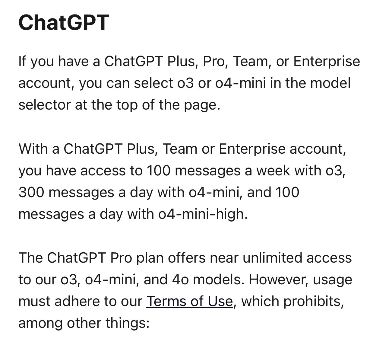 ChatGPT Plus、Team 或 Enterprise 账户,每周可以使用 o3 访问 50 条消息,而目前翻倍至每周 100 条,意味着用户平均每天可以访问 14 条。