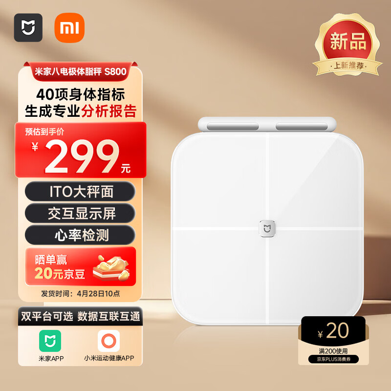 IT之家 4 月 24 日消息,小米米家八电极体脂秤 S800 现已在京东等平台开售,到手价 299 元,PLUS 会员补贴满 200 元再减 20 元(到手价 279 元),4 月 28 日 10 点发货。