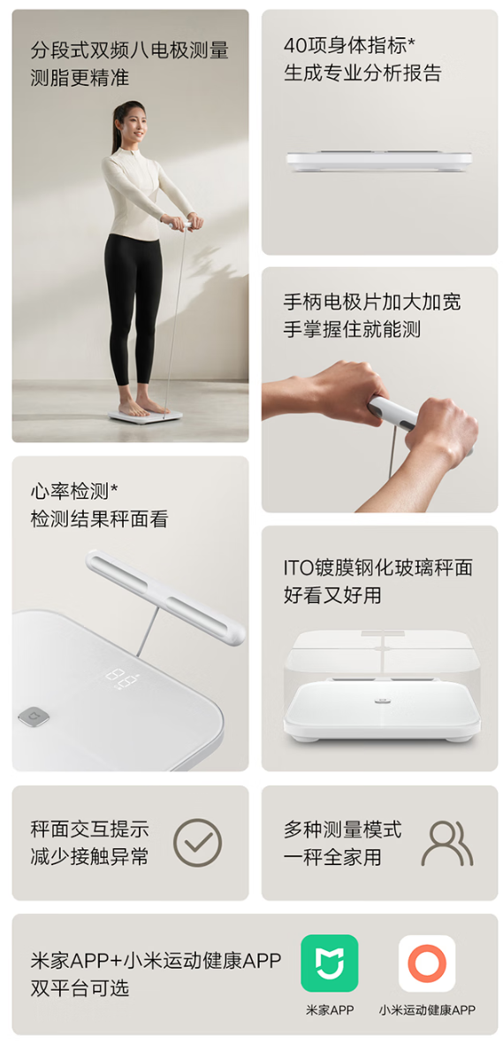 IT之家从商品页面获悉,新品四电极通过测量下肢推导身体数据,八电极通过手柄和秤面八个电极,向人体施加多频生物电信号,全面测量上肢、躯干、下肢五个部位。