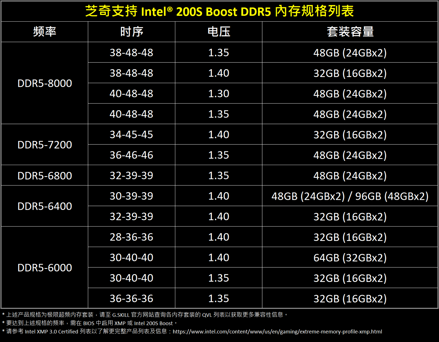芝奇具体支持 Intel 200S Boost 技术的内存规格如下: