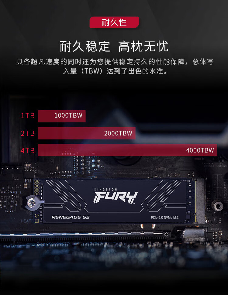 金士顿 FURY Renegade G5 固态硬盘享受 5 年有限质保,保内写入量为每 1024GB 对应 1PBW。