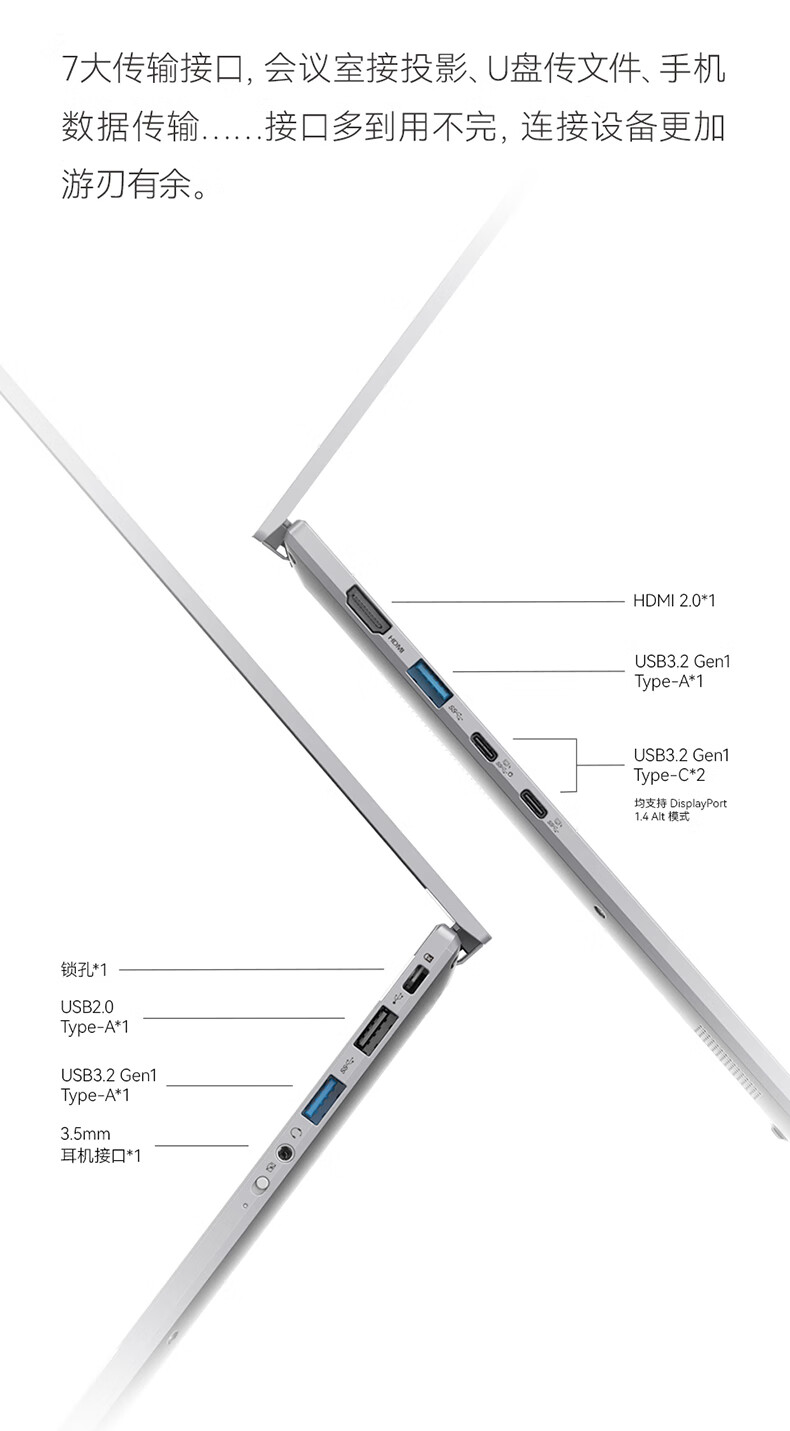 接口方面,惊鸿 14 AI 左侧配备 1 个 HDMI 2.0、1 个 USB-A 5Gbps、2 个支持 DP 1.4 Alt 的 USB-C 5Gbps;右侧则包含了 1 个安全锁孔、1 个 USB-A 480Mbps、1 个 USB-A 5Gbps 和 1 个 3.5mm 二合一音频插孔。