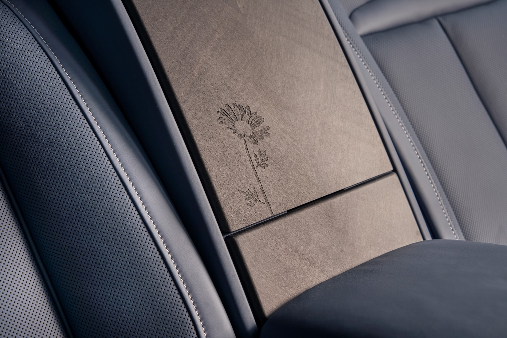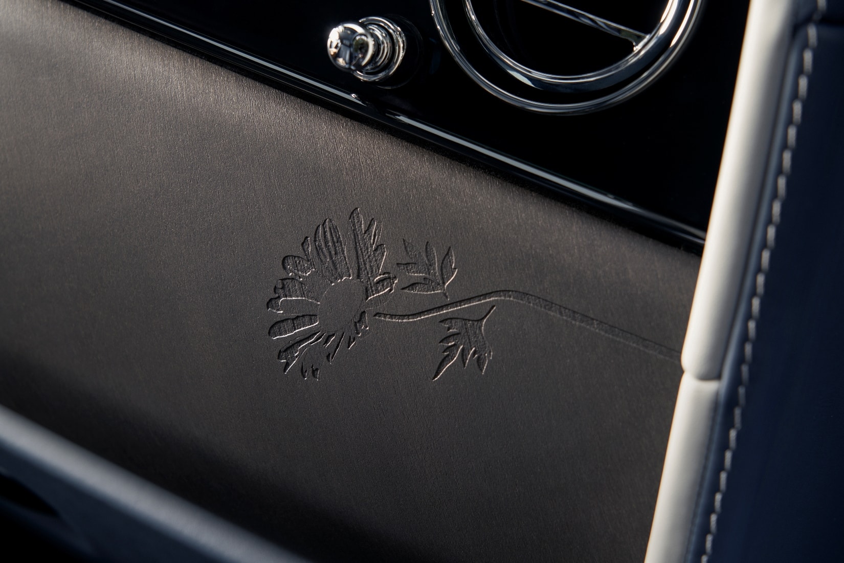 内饰方面,雏菊图案同样无处不在。车内黑木表面通过喷砂工艺雕刻出雏菊装饰,利用矿物颗粒微层蚀刻技术,呈现出三维效果。