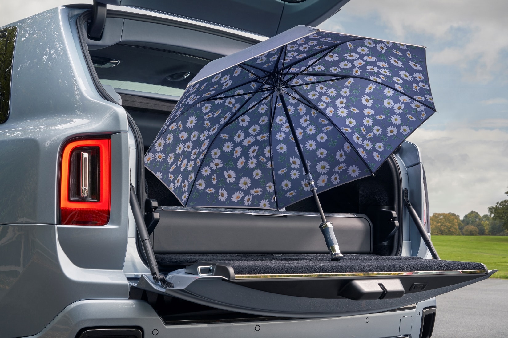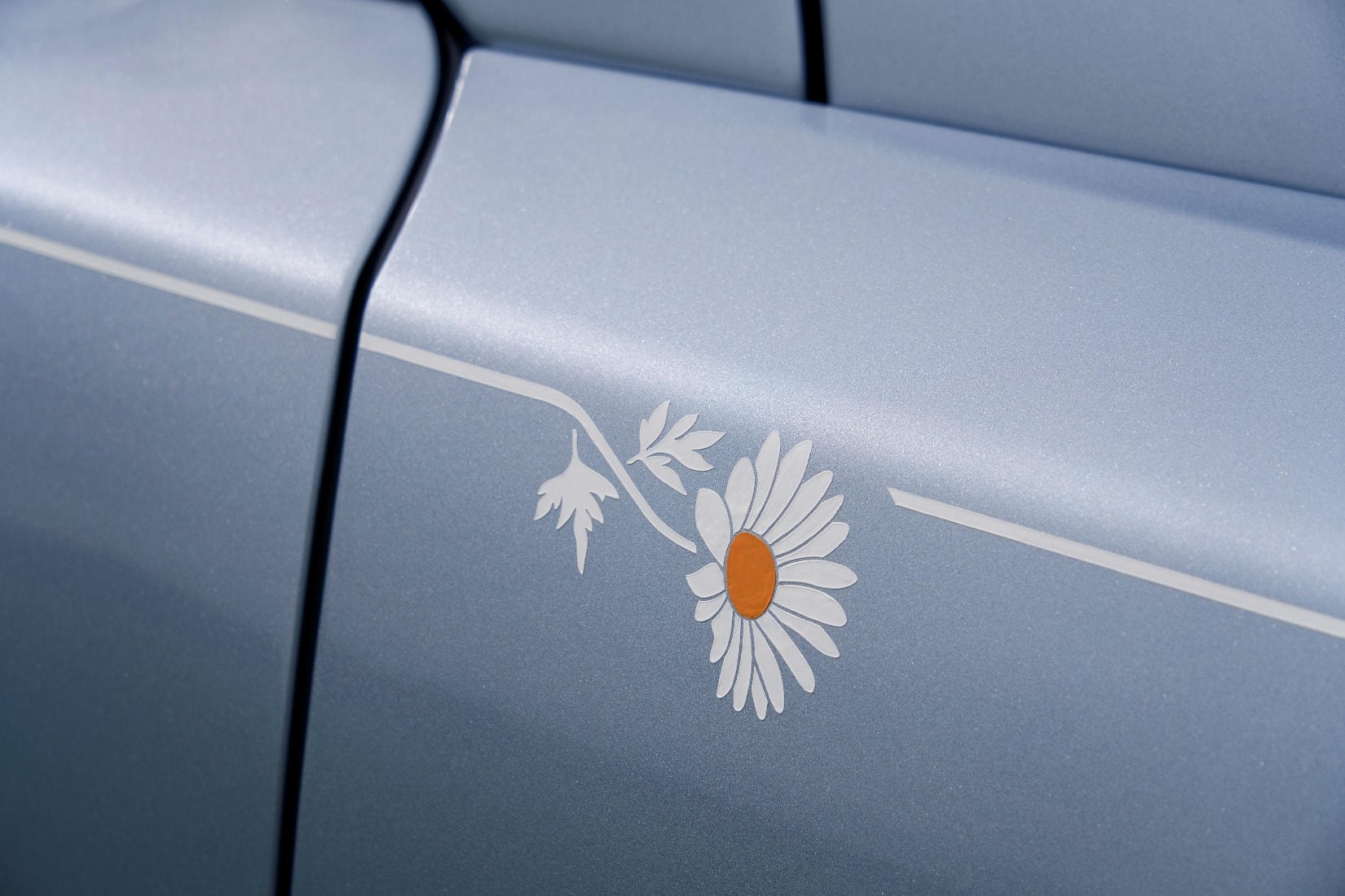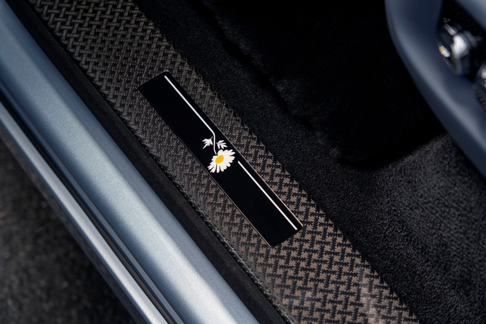 座椅采用 Fleet Blue 为主色调,搭配 Selby Grey 和 Black 三种颜色,踏板上也镶嵌发光雏菊图案,后门内还藏有雏菊主题定制雨伞。