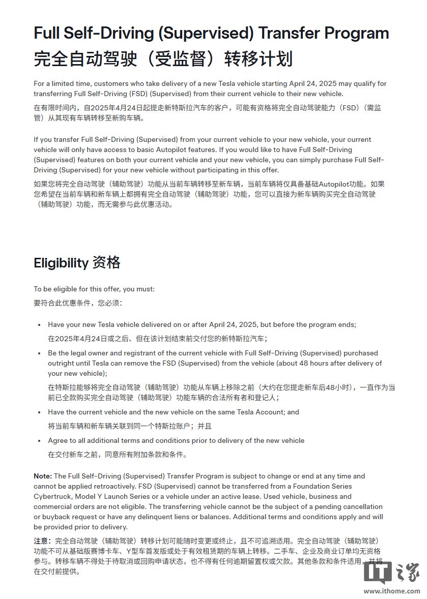 IT之家注意到,特斯拉曾在 2024 年 10 月 15 日推出 FSD 转移服务,允许在 2024 年 12 月 31 日前订购并交付 Model S / 3 / X / Y 全系车型的老车主将原车的 FSD 权益转移至新车。