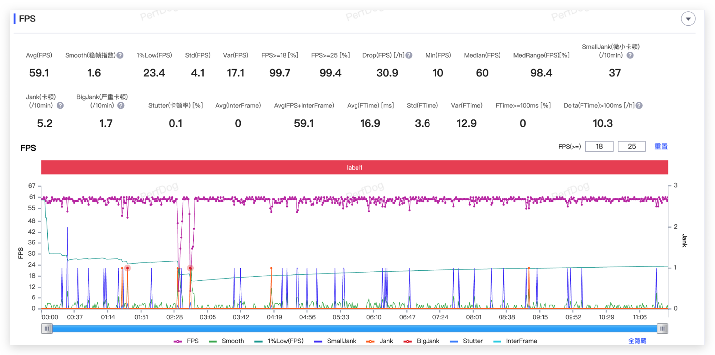 如下图所示,真我GT7实测帧率为 59.1fps,帧率比《原神》略低一些,游戏中最大的两次帧率波动(2 分钟左右),是笔者截图时产生,并非游戏实际掉帧。