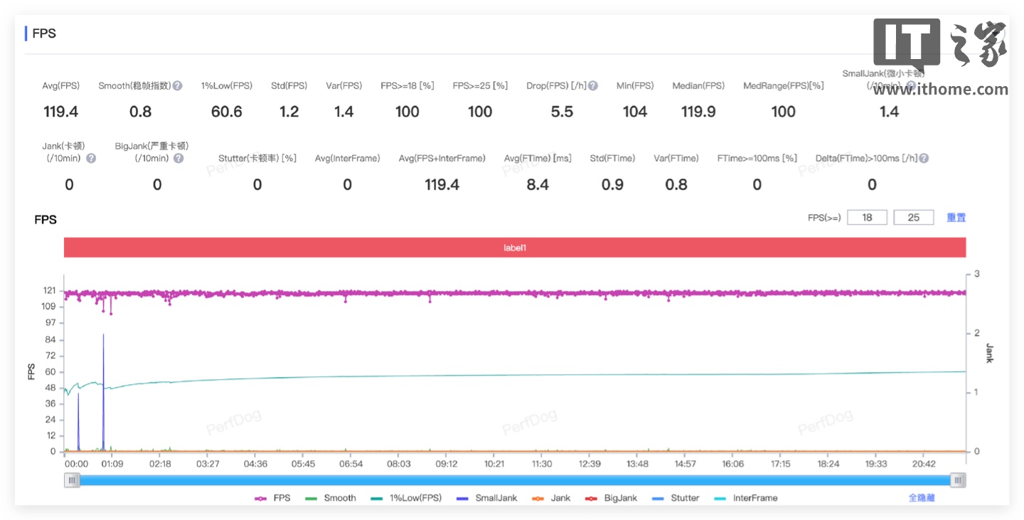 再来看看 120 帧画质的《和平精英》。这里测试了 20 分钟,刚好也是完整一局游戏。真我GT7拿下了 119.4fps,表现依旧稳定。