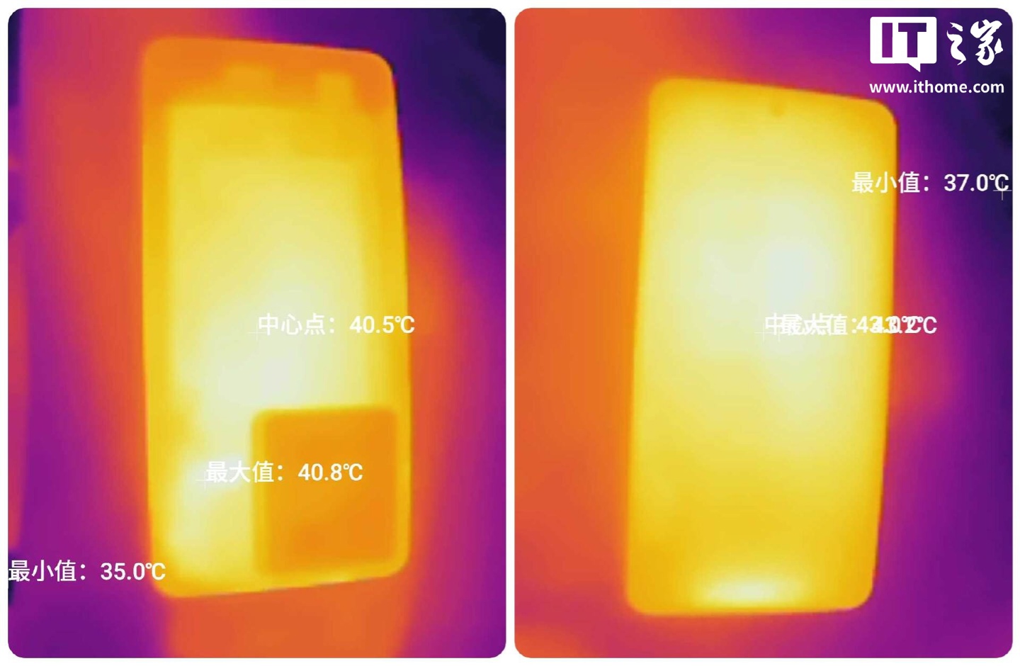 散热方面,IT之家进行了 30 分钟《原神》,随后热成像实测,正反最高温度为 40.8°C,热量集中在摄像头下方区域。