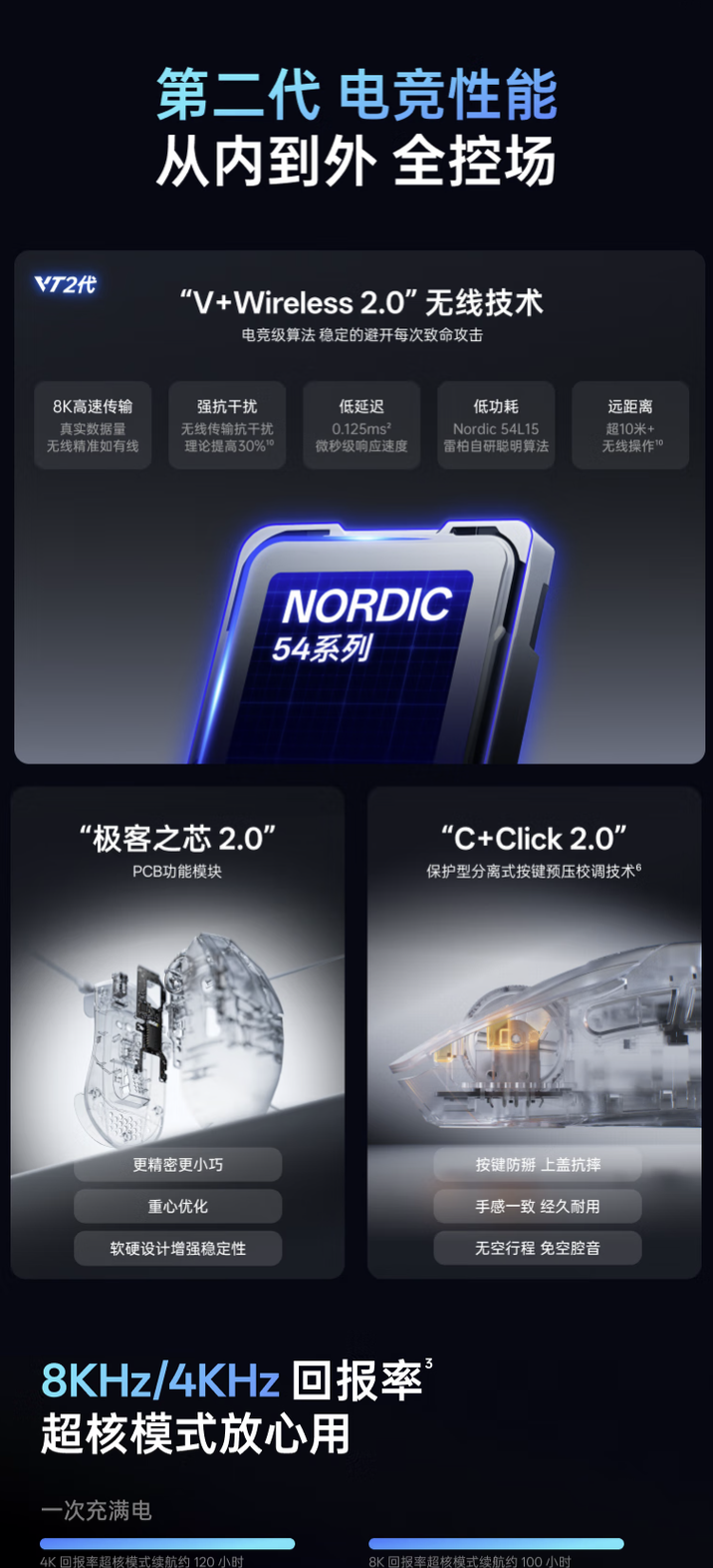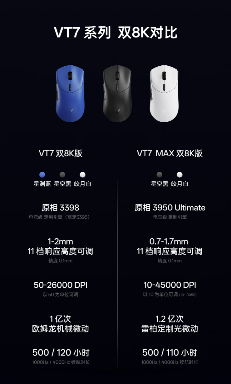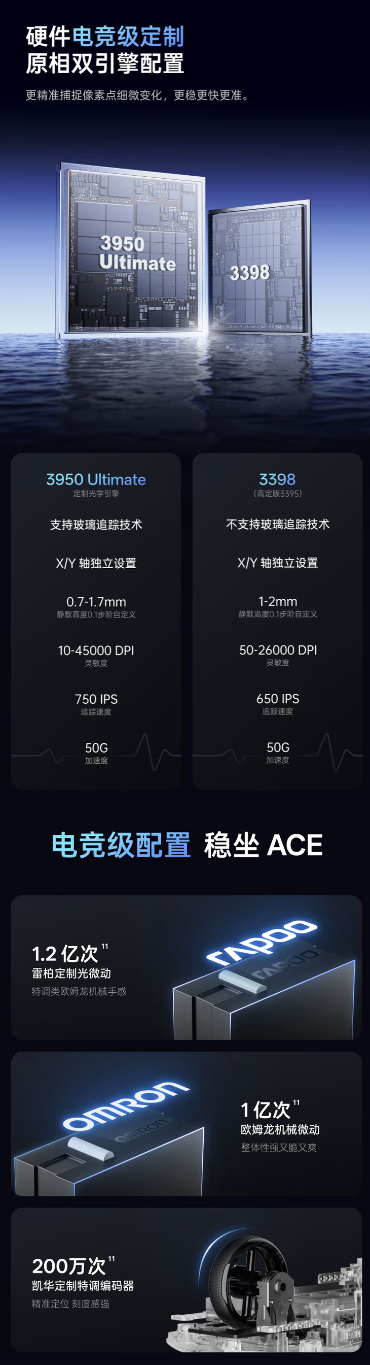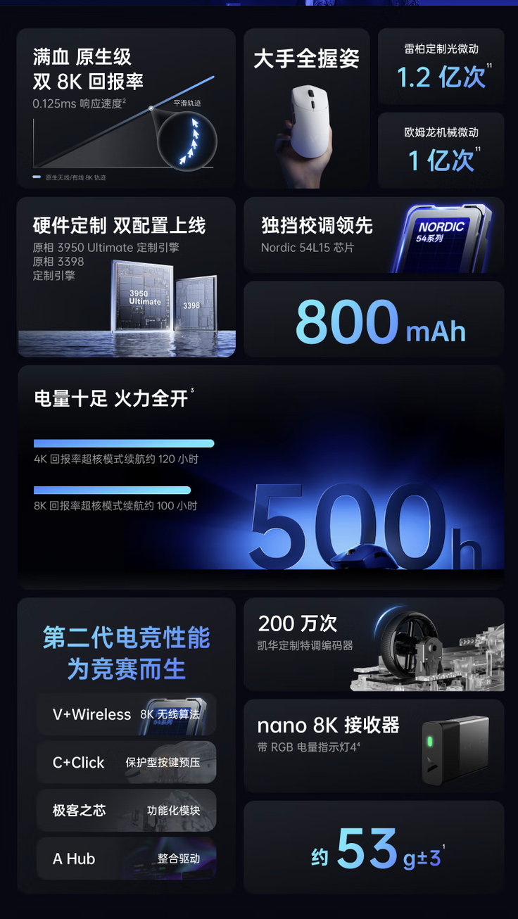 系列鼠标支持有线无线双 8KHz 回报率,内置 800mAh 电池(续航至高 500 小时),搭载 Nordic 54L15 主控,其中标准版采用原相 3398 传感器 + 欧姆龙机械微动,MAX 版采用 3950Ultimate 传感器 + 雷柏定制光微动。