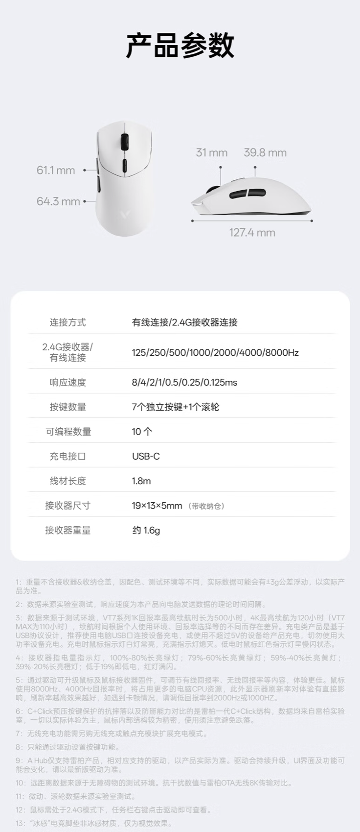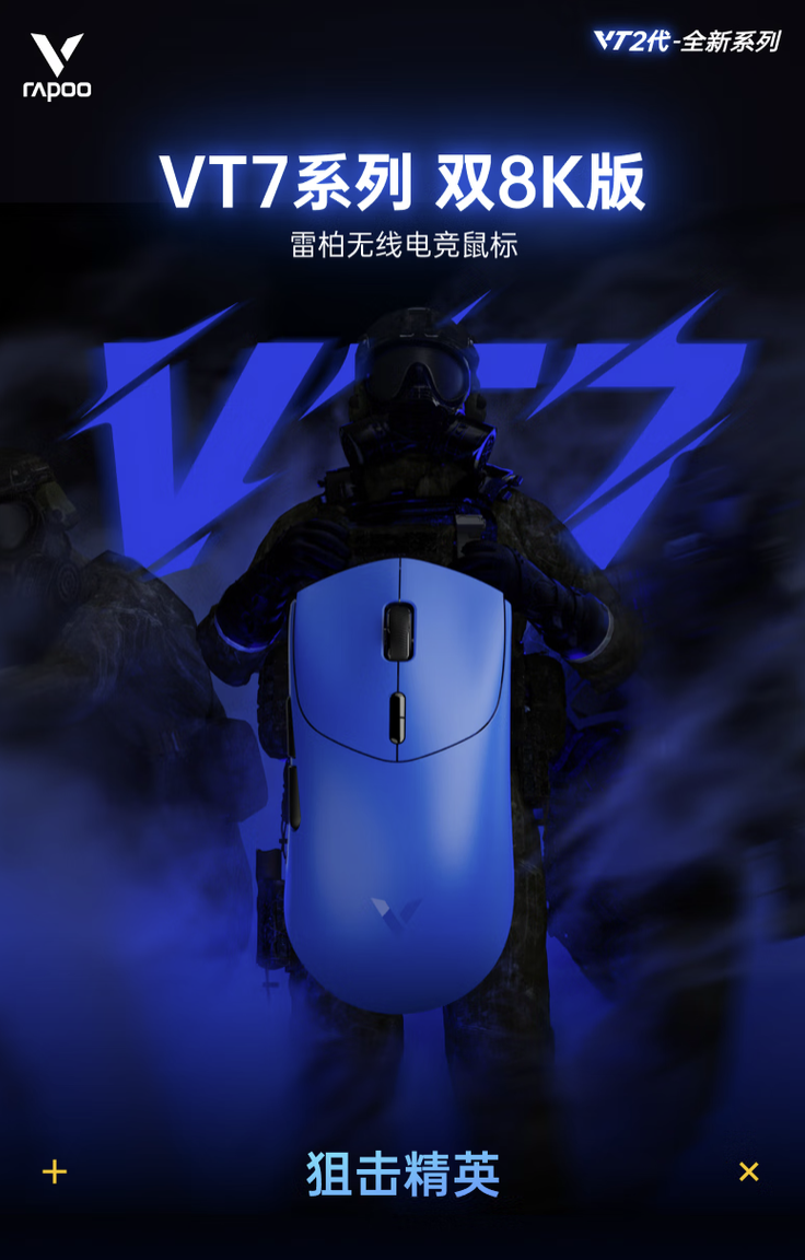 IT之家 4 月 25 日消息,雷柏旗下 VT7 系列双模(无蓝牙)游戏鼠标现已在京东开启首销,这款鼠标全球首发 NORDIC 54 系列芯片,重量为 53 克,售价 199 元起。