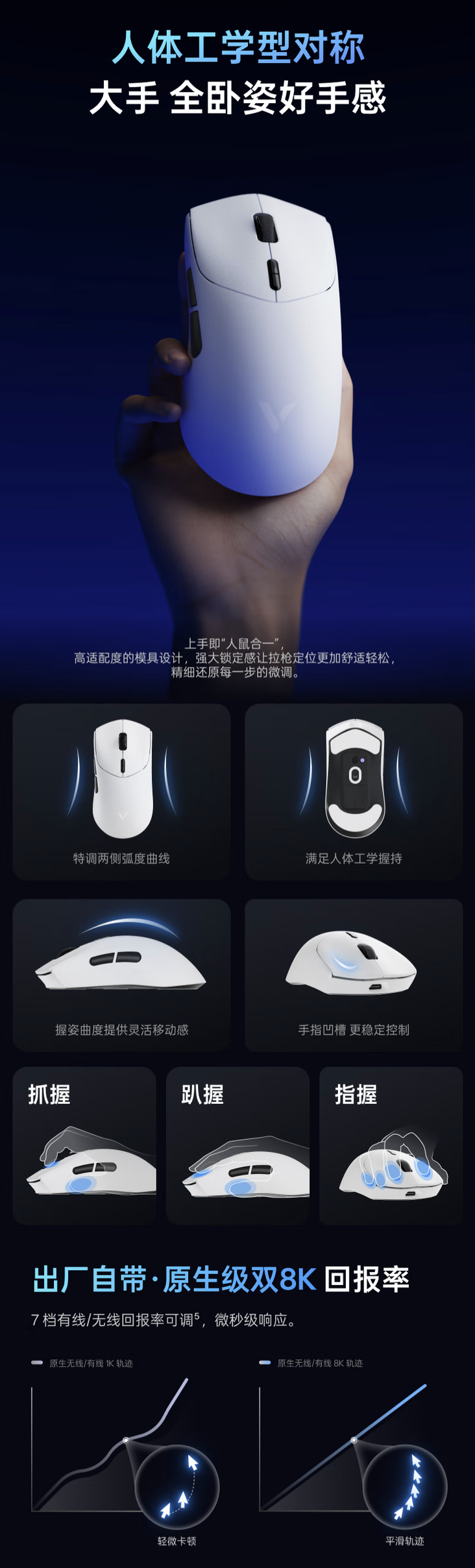 系列鼠标采用了人体工学对称式外观设计,适用于大手手型,适合抓握 / 趴卧 / 指卧使用。