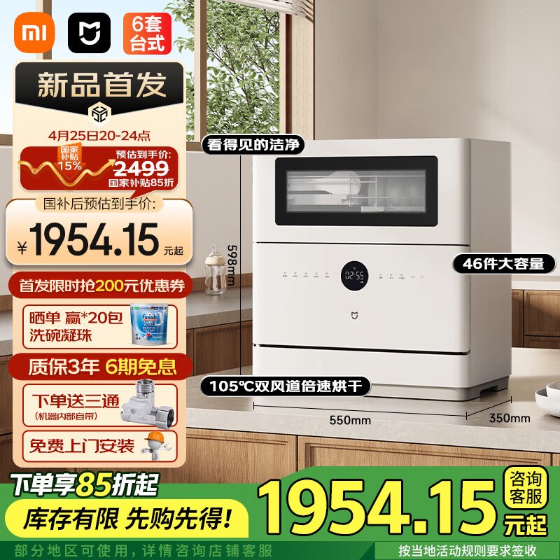 IT之家 4 月 25 日消息,小米米家台式洗碗机 6 套 S10 今晚在京东等平台开售,到手价 2299 元,国补价 1954.15 元起。