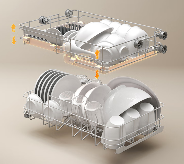 这款洗碗机内置 105℃双风道环流热烘,可提升内部空气循环,加速烘干餐具与内腔,防止顶部水珠残留,保持干燥洁净。同时,其在上中下三层喷臂基础上新增奶瓶独立喷臂,可利用 38 条高温高压水柱、30000Pa 水压多角度喷淋。