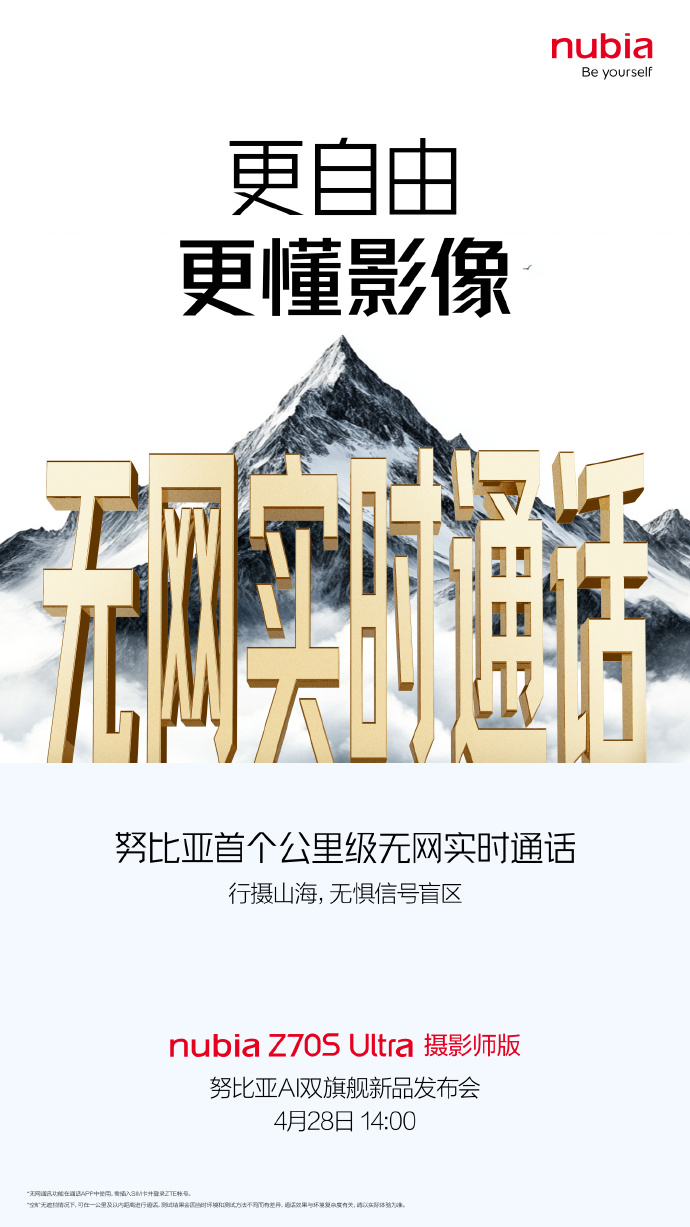IT之家 4 月 26 日消息,努比亚 Z70S Ultra 摄影师版将于 4 月 28 日发布,官方预热显示,该机将搭载努比亚首个公里级无网实时通话。
