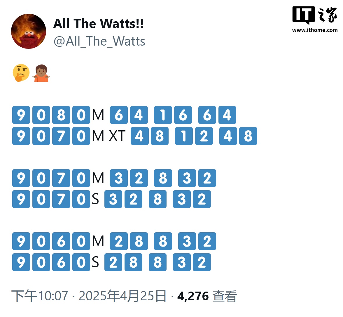 IT之家 4 月 26 日消息,消息源 @All_The_Watts 昨日(4 月 25 日)在 X 平台发布推文,分享了关于 AMD Radeon RX 9000M 系列笔记本显卡的相关信息。