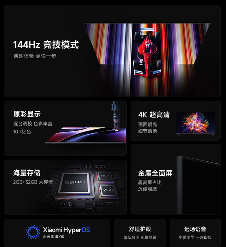此外,该机还搭载四核处理器、2GB+32GB 存储空间、小米澎湃 OS,支持小爱同学 AI 助手、远场语音操控、音频投射、多功能投屏等。