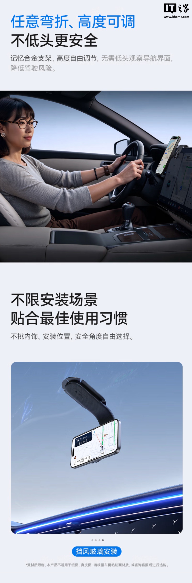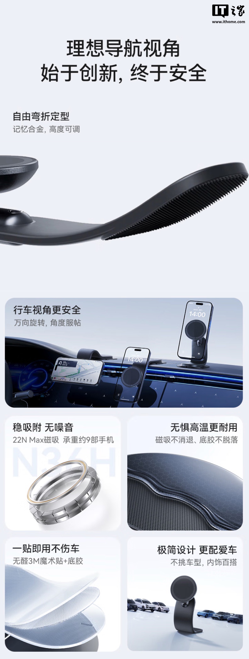 据介绍,该车载支架使用肤感漆面 + 黑松露配色,采用记忆合金打造,可实现自由弯折定型,配备“苹果 MagSafe 同源”N36H 磁环,可实现 16N 磁吸(官方称使用磁吸手机壳后 22N)。