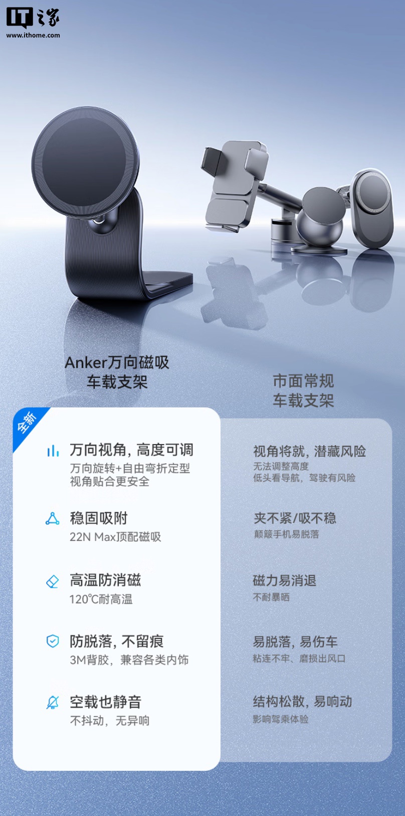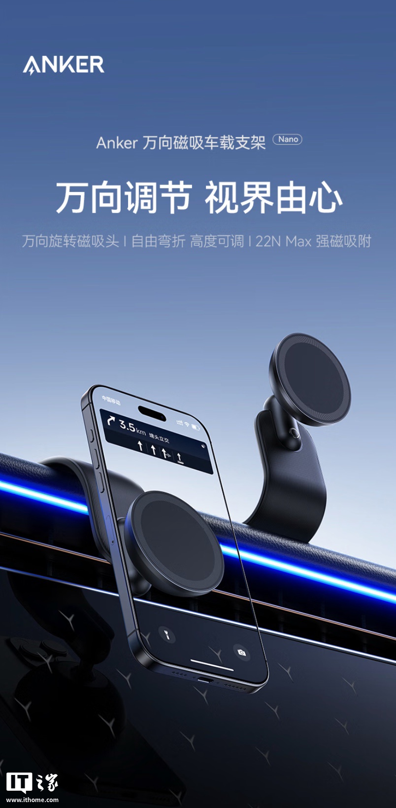IT之家 4 月 27 日消息,安克现已在京东上架 ANKER Nano 车载磁吸支架,主打“16N 磁吸、万向旋转”,但该支架不提供无线充电功能,仅提供 USB-C 线,定价为 139 元。