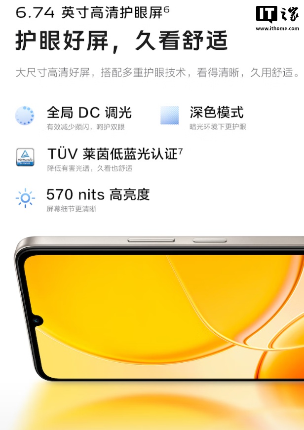 新机通过 SGS 五星整机抗跌耐摔认证,支持 IP64 级防尘抗水。vivo Y37c 还配备 6.74 英寸高清护眼屏,支持全局 DC 调光、拥有 570nits 亮度、通过 TUV 莱茵低蓝光认证。
