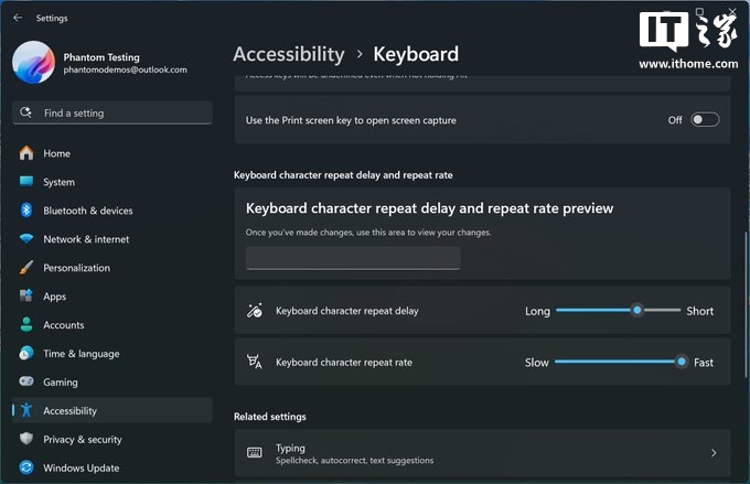 IT之家注意到,专注于挖掘微软新动态的 PhantomOfEarth 在 Windows 11 Dev 和 Canary 测试版本中发现了一个默认隐藏的新功能:当启用该功能后,所有与键盘按键重复相关的设置将被迁移到设置面板中。由于这一变化目前仍处于测试阶段,且默认隐藏,因此尚未出现在正式版本中。用户在目前仍需继续使用控制面板来调整键盘按键重复设置。