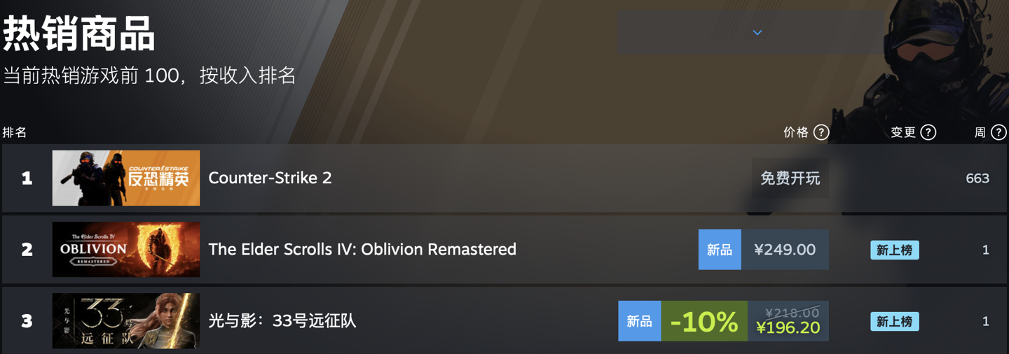 尽管遭遇《上古卷轴 4:湮没重制版》的突袭式发售,《光与影:33 号远征队》依然成功吸引玩家关注。截至发稿日期,该作位于 Steam 中国区热销游戏榜第二位,仅次于《CS2》,全球榜第三位,仅次于《CS2》和《上古卷轴 4:湮没重制版》,峰值同时在线人数为 98591。