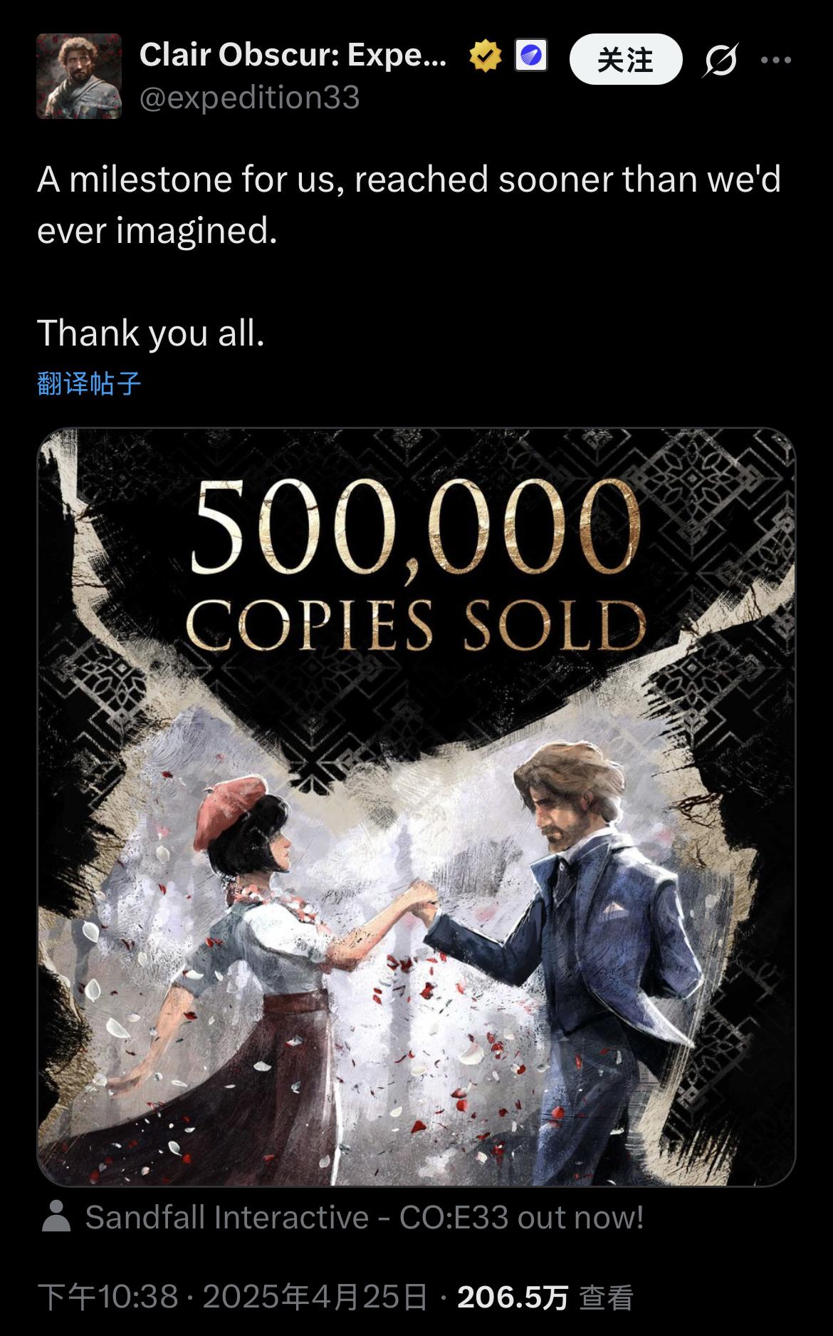 IT之家 4 月 27 日消息,Sandfall Interactive 工作室的首部作品《光与影:33 号远征队》的全球销量于前日突破 50 万份,且获得多家游戏媒体接近满分的评价。这款于 4 月 24 日发售的回合制 RPG 同步登陆 PS5、Xbox Series X|S 及 PC,并于发售日加入 Xbox Game Pass。
