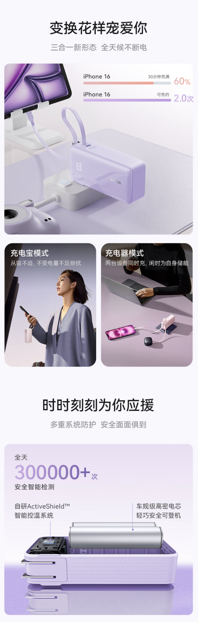作为比较,其中的“能量棒”三合一充电头 / 移动电源可选粉 / 紫双色外观,配备 LED 数显,拥有 10000 毫安时容量,提供可折叠插脚,单独购买定价为 299 元。