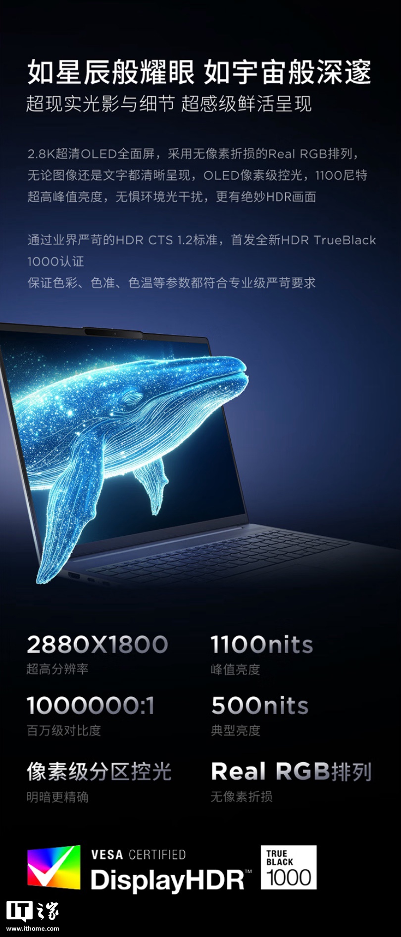 该机搭载一块 2880x1800 分辨率 120Hz 可变刷新率 OLED 面板,峰值亮度至高 1100 尼特,GtG 响应速度 0.2ms,动态对比度 1 百万:1,支持 10-Bit 色彩。同时带有 1080P 摄像头,支持 IR-ToF Windows Hello 解锁。