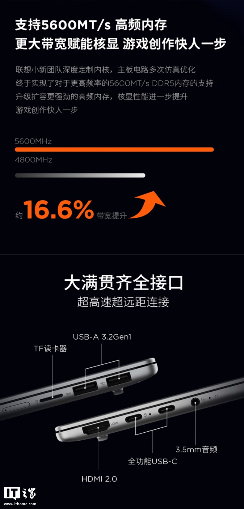 接口方面,该机左侧配备 1 个 HDMI 2.0 接口、2 个“全功能”USB-C 接口、1 个 3.5mm 音频接口;1 个 TF 卡读卡器、2 个 USB-A 3.2 Gen 1 接口。