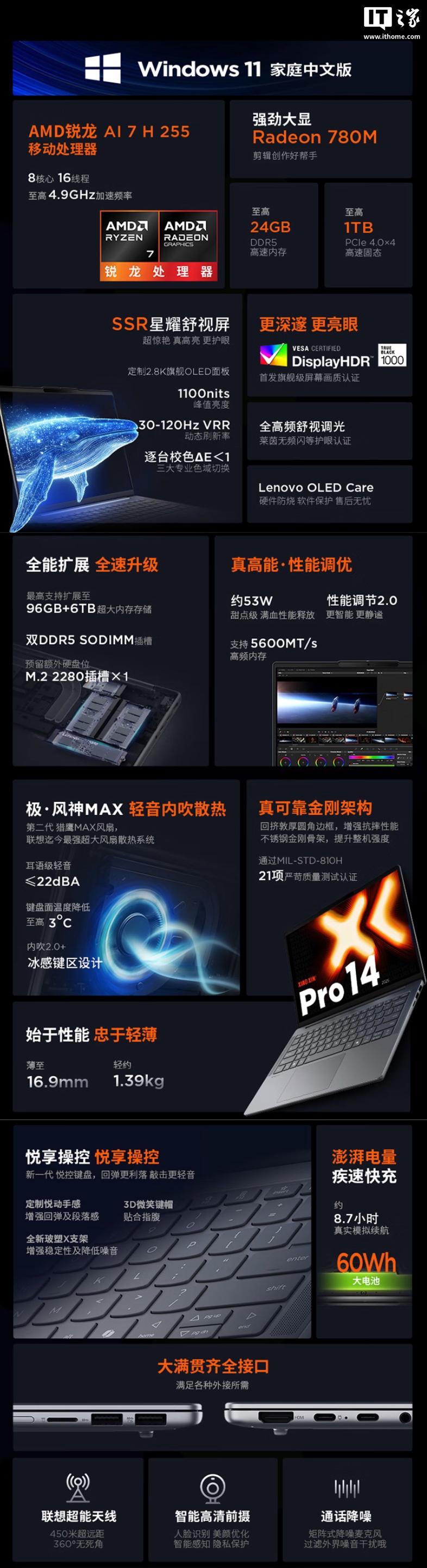 该机采用 CNC 金属一体化机身,边缘圆润,机身整体重量 1.39 千克,厚度 16.9 毫米,中置不锈钢骨架,通过了 MIL-STD-810H 测试,笔记本内置 60Wh 电池,支持 100W PD 充电,支持 Wi-Fi 6。