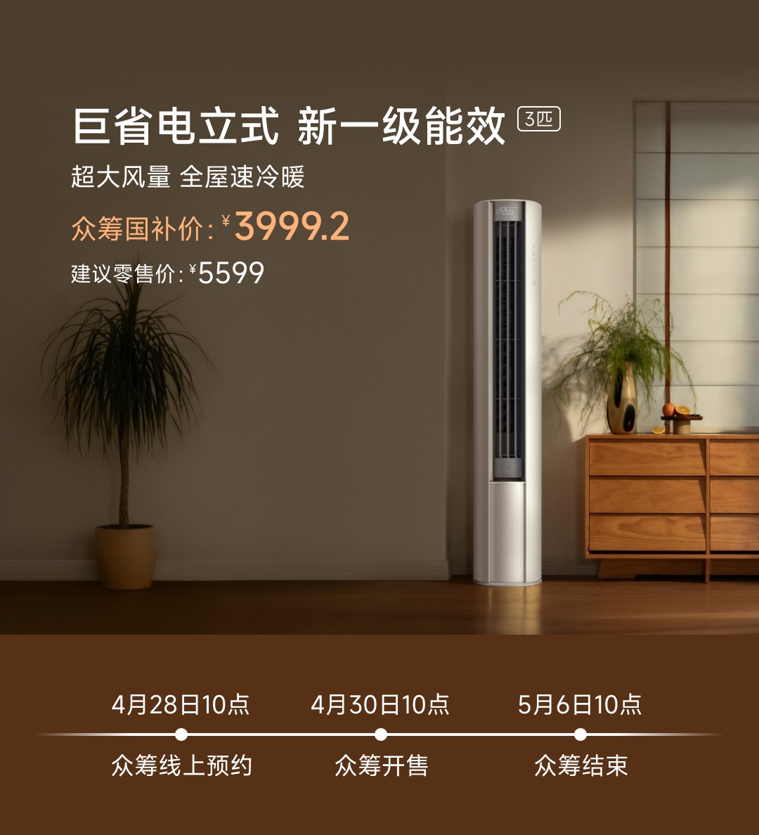 IT之家 4 月 28 日消息,小米今日上架了一款新的空调型号“米家空调巨省电立式 3 匹新一级能效”,建议零售价 5599 元,众筹价 4999 元,众筹国补价 3999.2 元。