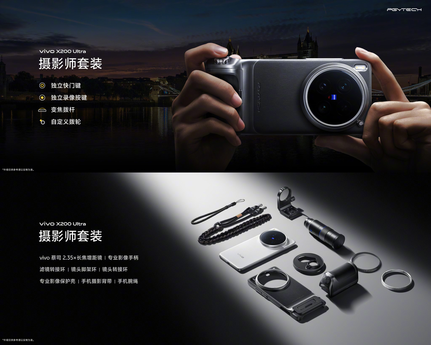 新机的相机控制键具备双击快启、滑动变焦、轻按锁焦、全按快门、长按连拍、滑动调节曝光等核心操控。摄影师套装,独立手柄配有快门按键与变焦拨杆;组合手机和手柄,达到 6000mAh+2300mAh 超大电池;还有标配 67mm 滤镜转接环。