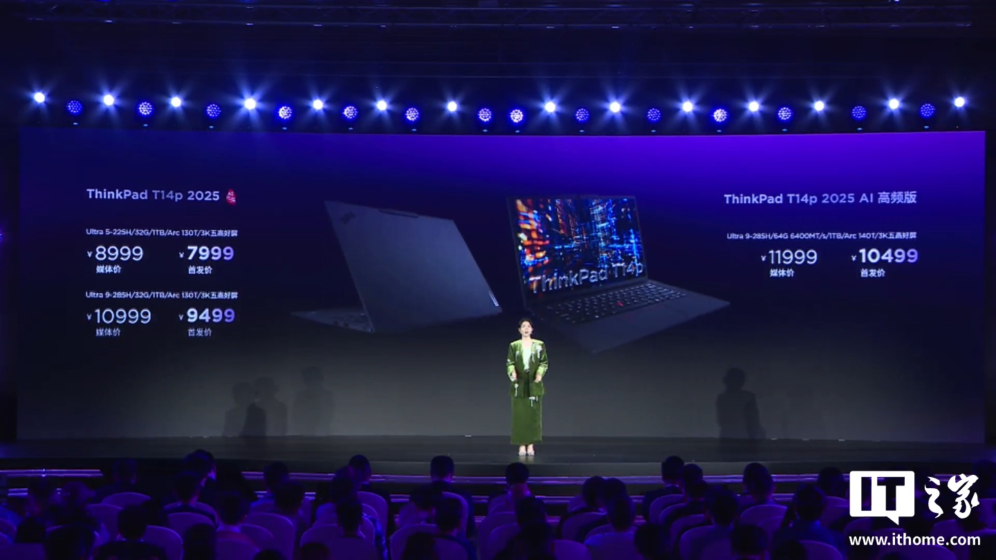 ThinkPad T14p 2025 AI 元启版可选酷睿 Ultra 5 和 Ultra 9 配置,PPT 显示为 Arc 130T 核显,首发价分别为 7999 元和 9499 元。
