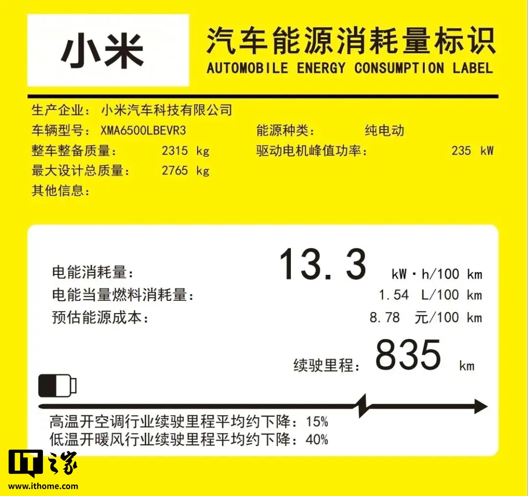 从工信部披露的详细信息来看,新增的 835 公里续航版本车型型号为 XMA6500LBEVR3,其电池能耗量为 13.3 千瓦时 / 100 公里,整备重量达到 2315 公斤。